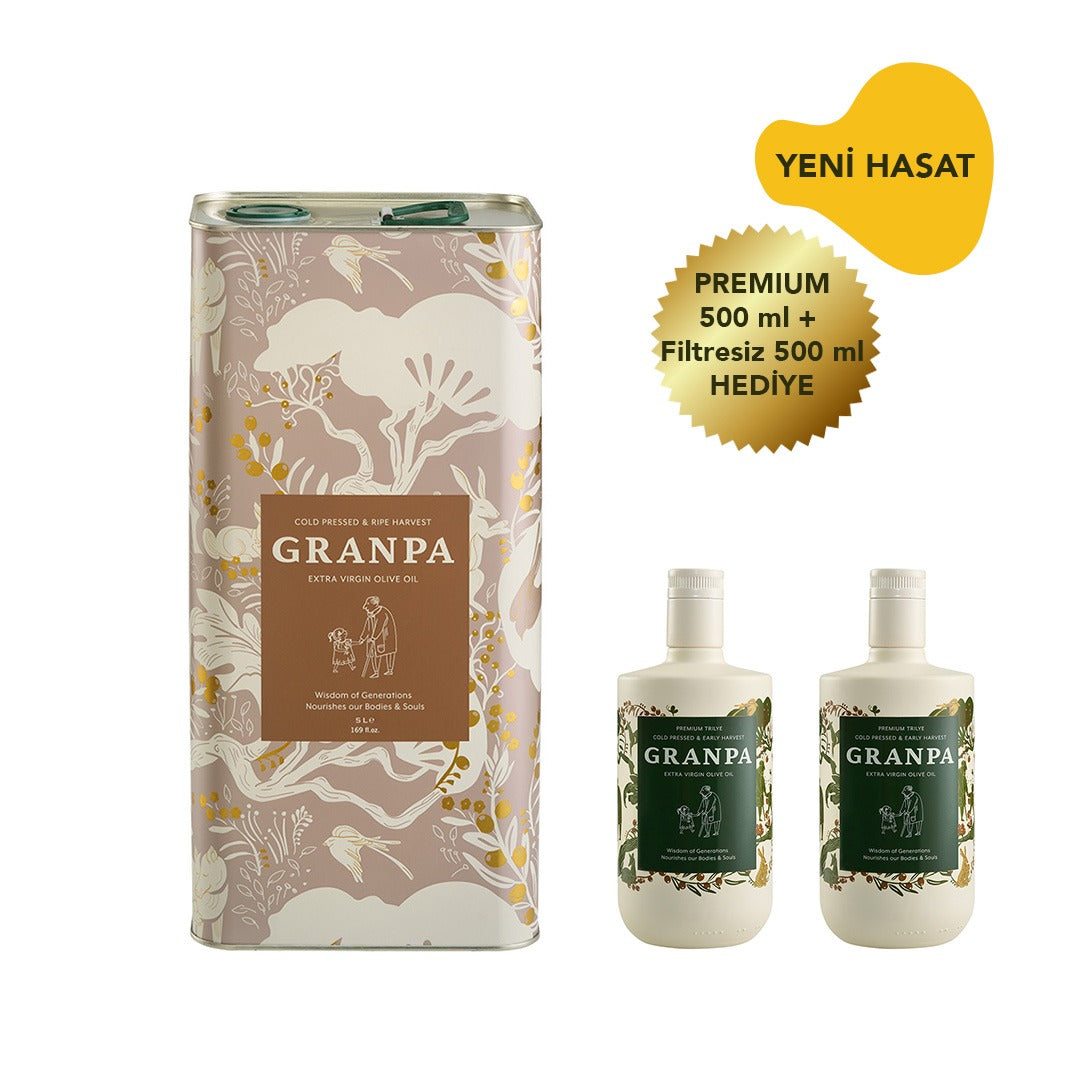 Granpa Gold 5 L Erken Hasat Soğuk Sıkım Zeytinyağı + (1 x Premium Trilye Filtresiz 500 ml Zeytinyağı + 1 x Premium Trilye 500 ml Zeytinyağı)