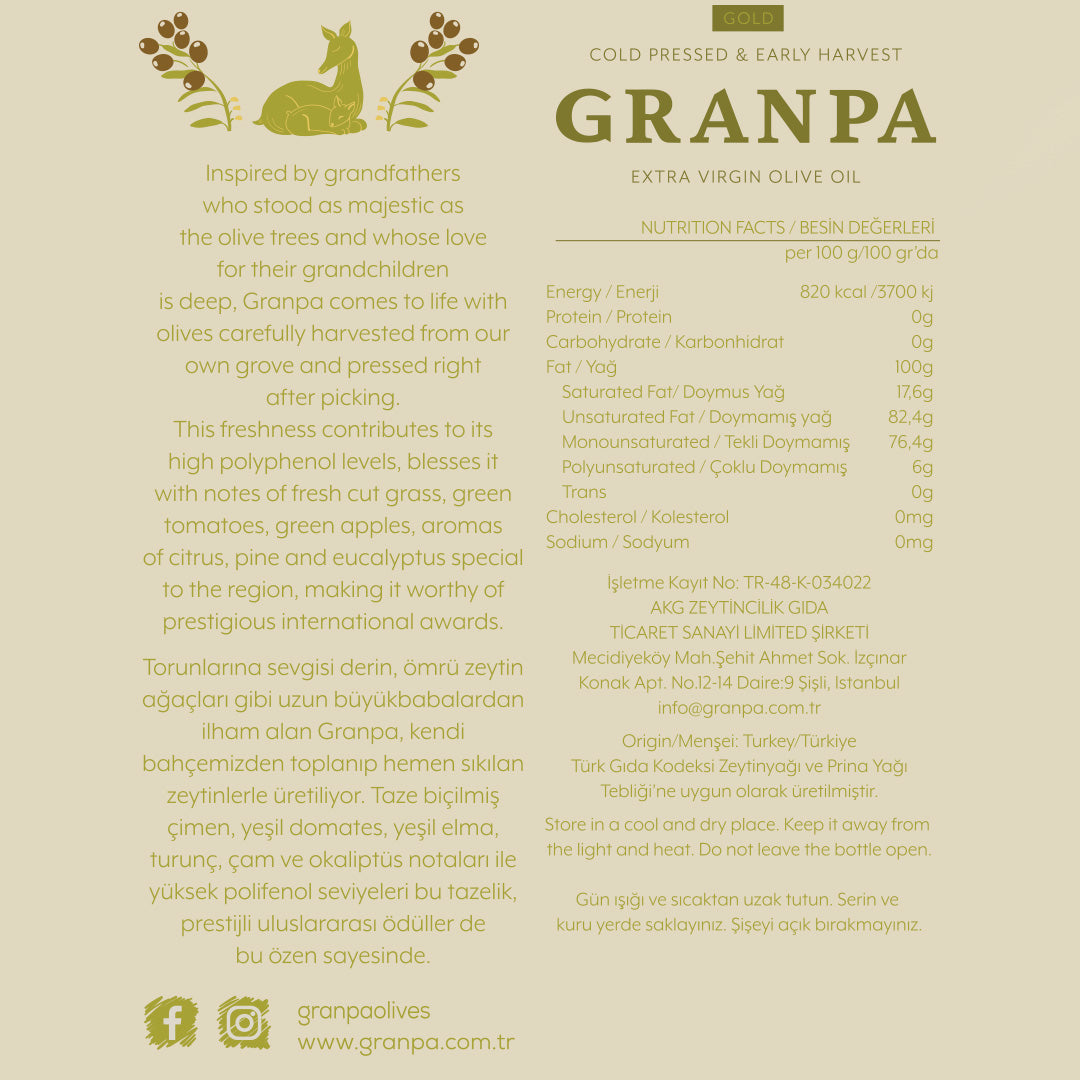 Orta-büyük boy Trilye zeytinleriyle üretilen bu özel seri, toplandıktan sadece birkaç dakika sonra, 22°C’de soğuk sıkım tekniğiyle işleniyor.